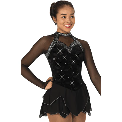 Svart elegant konståkningsdräkt från Jerrys Skatewear, i sammet med skira ärmar i matchande mesh. Mönster i silverglitter som blir väldigt effektfullt. Flikig kjol som är kantsydd med silverfärgad tråd. Gnistrande kristaller fram.