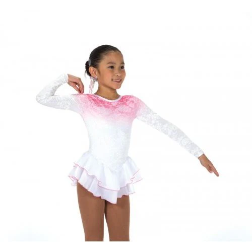 Vacker vit dräkt i stretchig spets med rosa inslag. Fodrad. Dubbla lager kjol i georgette. Rosett bak med kristaller.