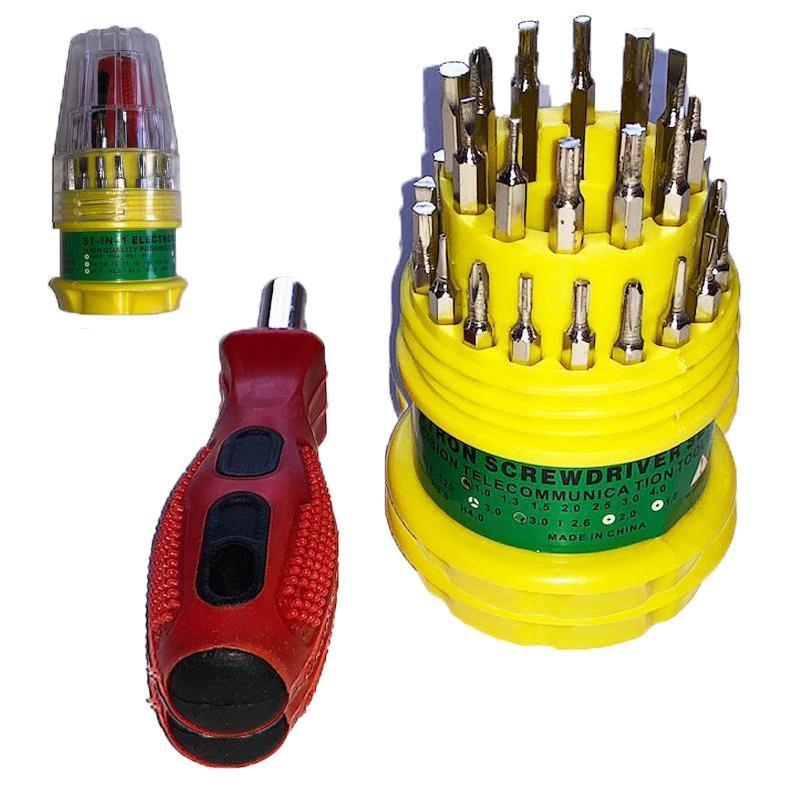 Smart skruvmejselsats med 31 delar. Monteras i en liten smart låda som är lätt att bära. Skruvmejsel ingår i satsen.