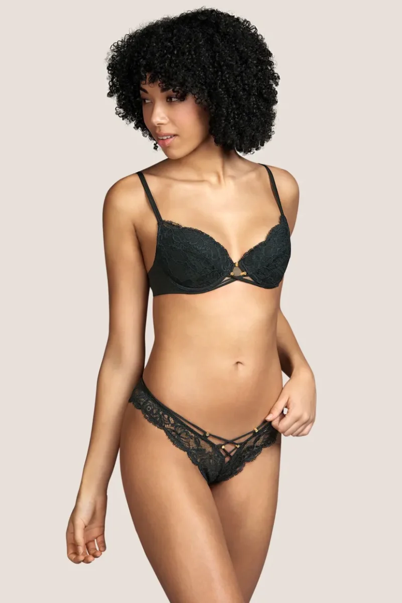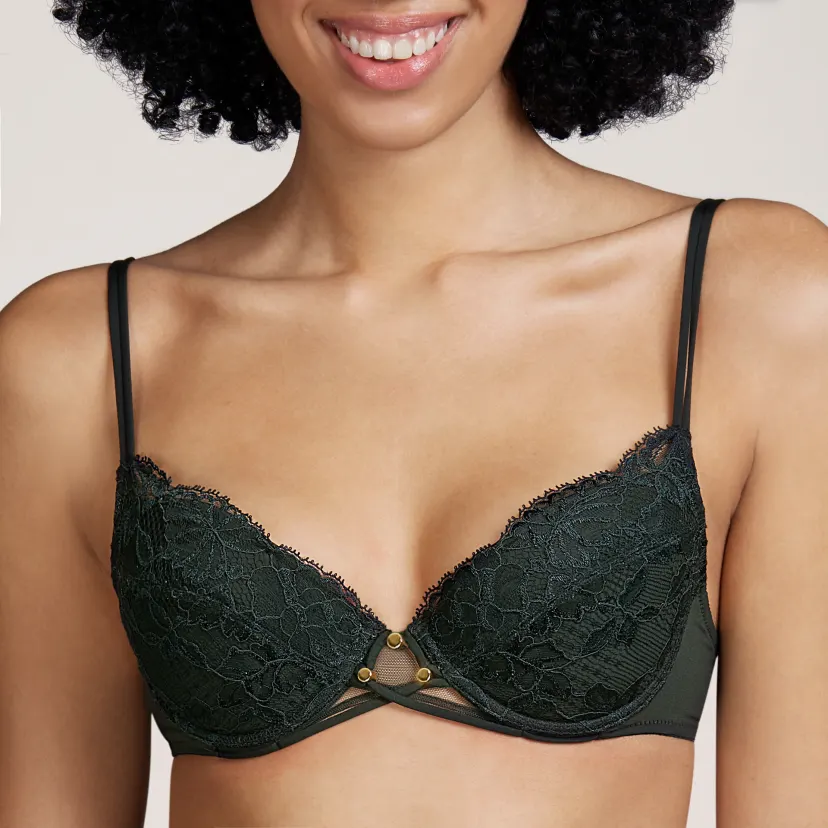 En vadderad push up BH med bygel och en mjuk och elegant känsla från Andres Sardas serie Nadia i färgen Deep Forest. Framtill mellan bysten skapas en kontrast med de tunna flerlagersbanden som har små gulddetaljer. Helheten har en förförisk look tack vare BH:ns passform som ger bysten ett extra lyft! Push up-inläggen kan lätt tas bort.