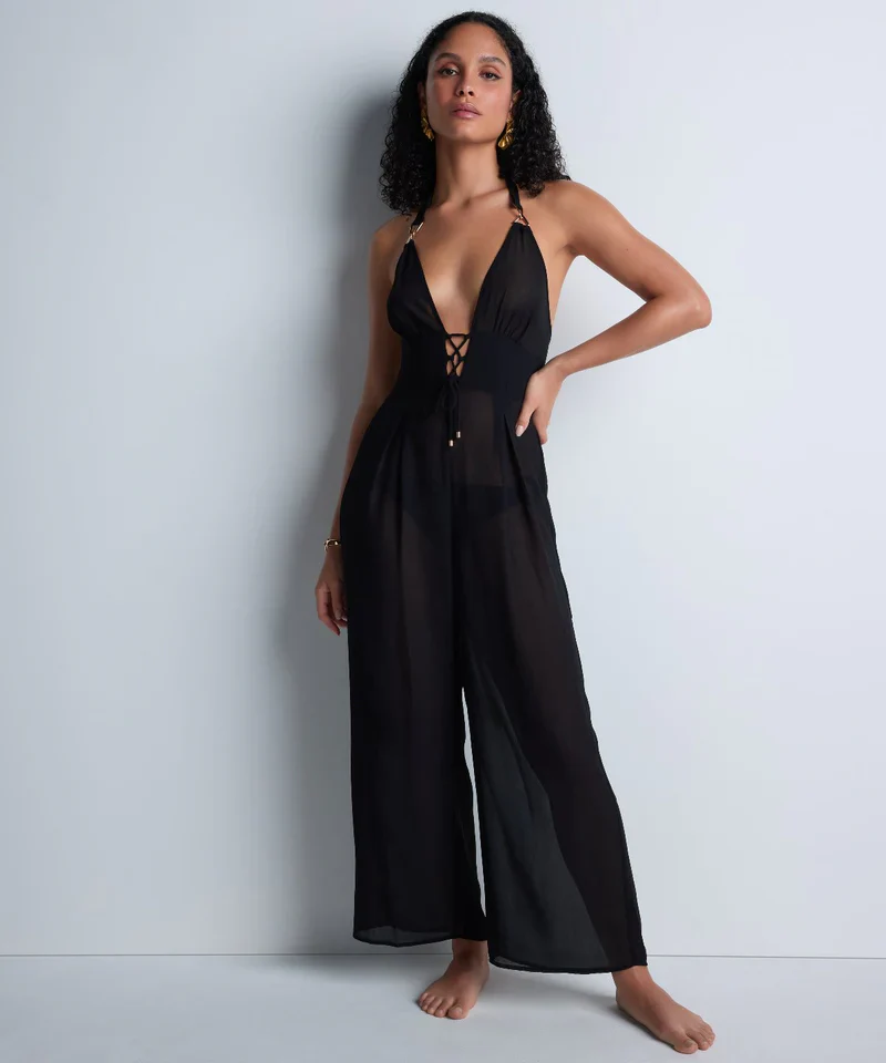 Beach Walk-jumpsuiten är designad för att skapa en oemotståndlig look och har en djup halsringning som fortsätter ner i en sexig snörningsdetalj, medan axelbanden är kantade med eleganta inslag av guld. Den är brett skuren vid benen och figursydd i midjan och ger struktur åt silhuetten med stil och sofistikering. Den knyts i nacken.