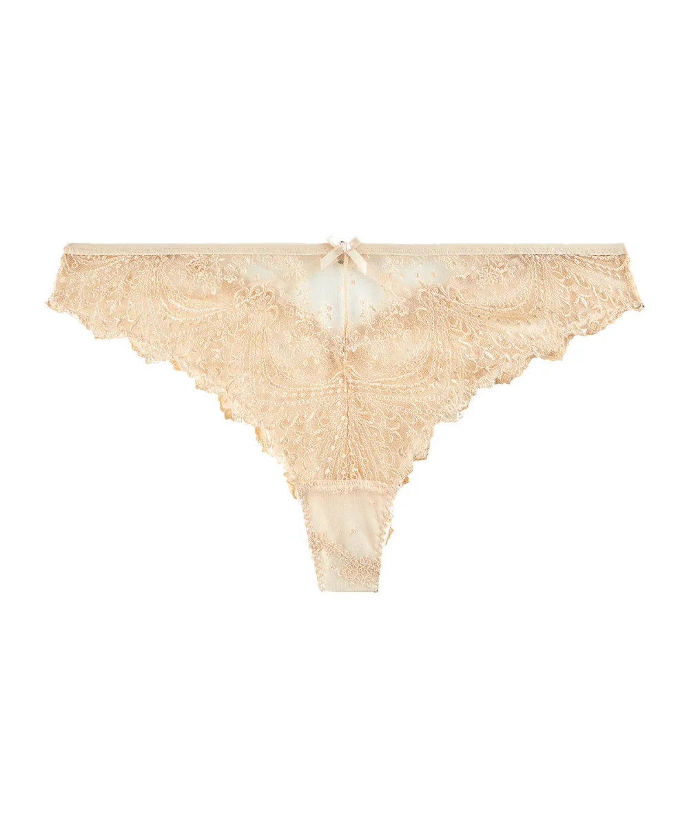 Tanga från Aubade’s serie Écrin Noir i färgen Silk Heaven. En elegant tanga-brief med ett elegant och sexigt broderi som framhäver höfterna och formen på stussen, vilket skapar sensuella genomskinliga effekter. Detaljerna med snörningar inspirerade av bondage. Dekoreras av smyckesringar med diamanter, Swarovski-droppar och satinrosetter.