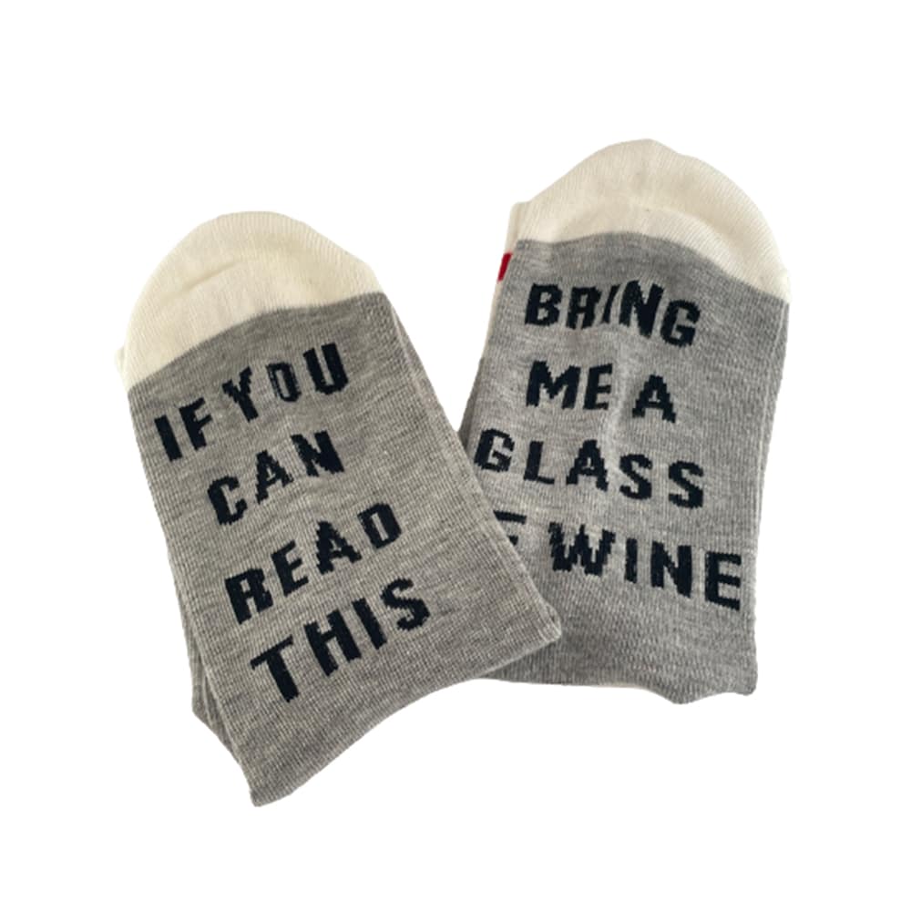 En supergalen och rolig present: ett par strumpor med texten “If you can read this, bring me a glass of wine”.