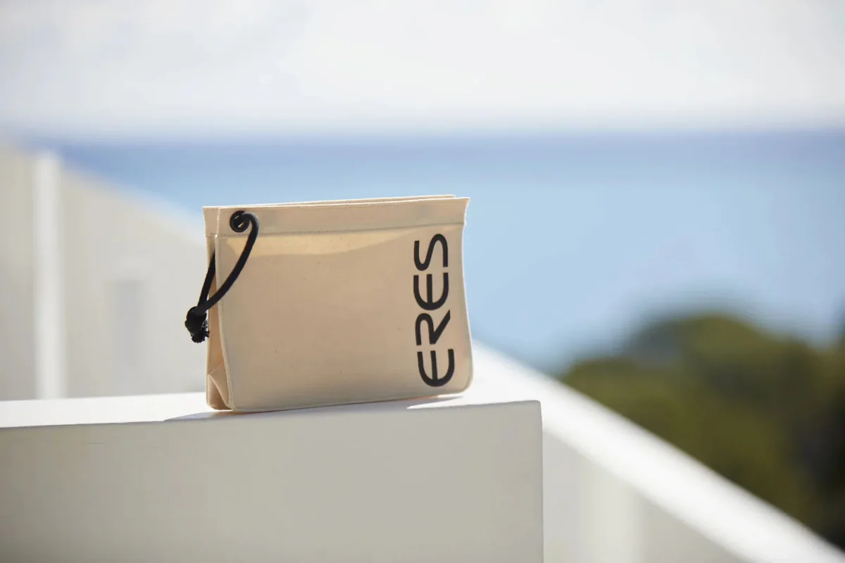 Vi köp av badkläder från ERES erhålles en strandnecessär. Strandnecessären från ERES är ett engagemang i en process av kontinuerlig förbättring och strävan efter att respektera miljön. De har därför utvecklat en ekodesign-version av baddräktens förpackning i ekologisk bomull och återvunnen polyester. ”Det var viktigt för oss att skapa en påse som du kan ta med dig överallt, en som skulle hålla din baddräkt säker under lång tid och kanske en dag överlämna den.”