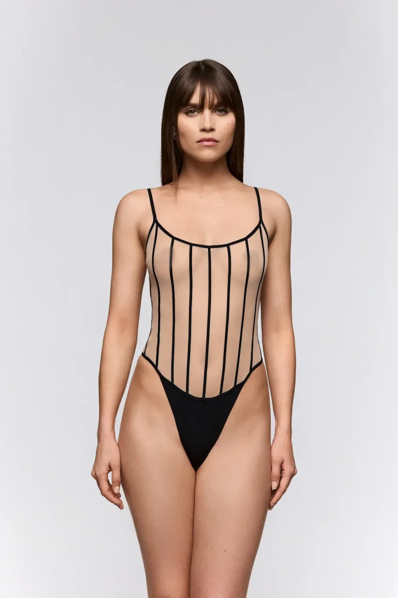 Sarda Yulimar Body är en statement body med grafiska linjer som framhäver kroppen på ett självsäkert och sensuellt sätt. Den transparenta meshkvaliteten kombineras med markerade, svarta linjer som skapar kontrast och ger bodyn sitt karaktäristiska uttryck.